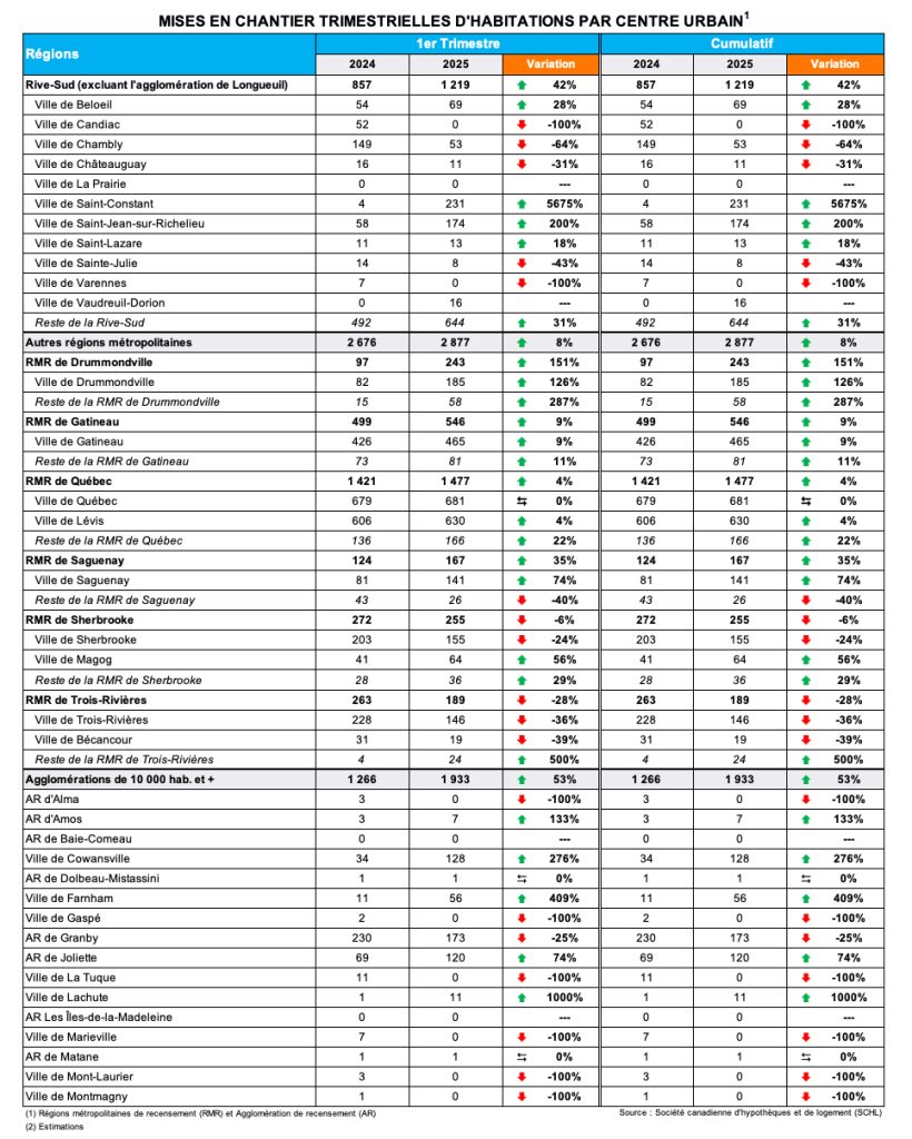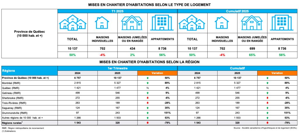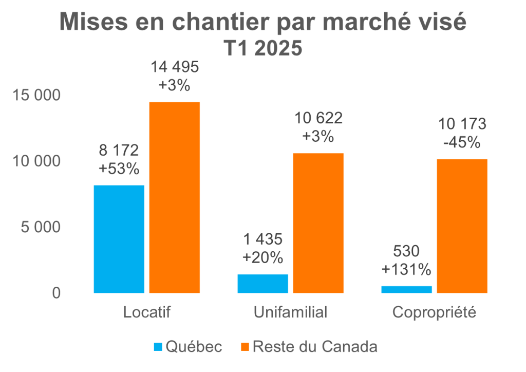 L’année 2025 a commencé en force avec une hausse de 50 % des mises en chantier au 1er trimestre de 2025 par rapport à la même période l’année précédente. Le Québec performe bien comparativement au reste du Canada, où les mises en chantier pour le premier trimestre ont chuté de 18 %. La hausse observée au Québec s’explique principalement par le grand nombre de mises en chantier pour le marché locatif : ces unités représentent environ 80 % des habitations mises en chantier cette année.