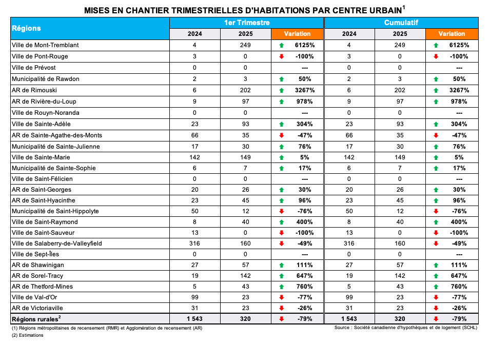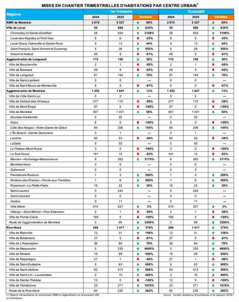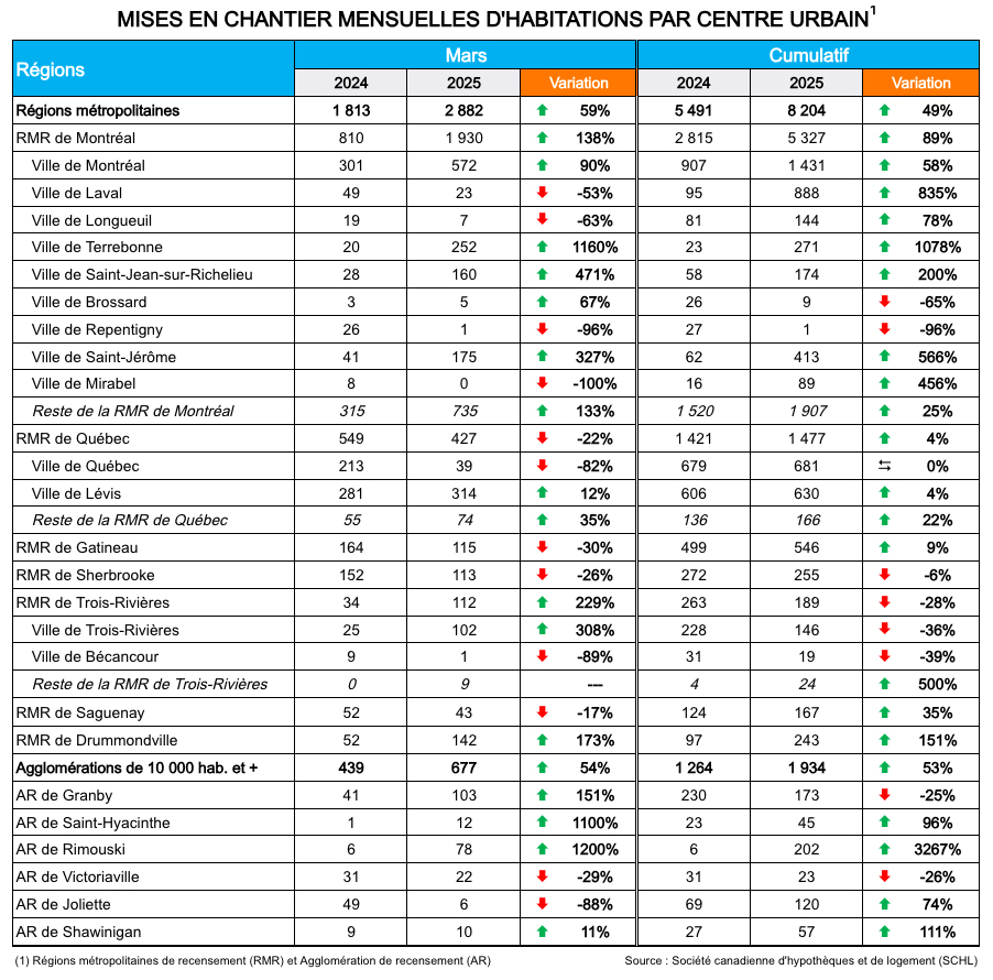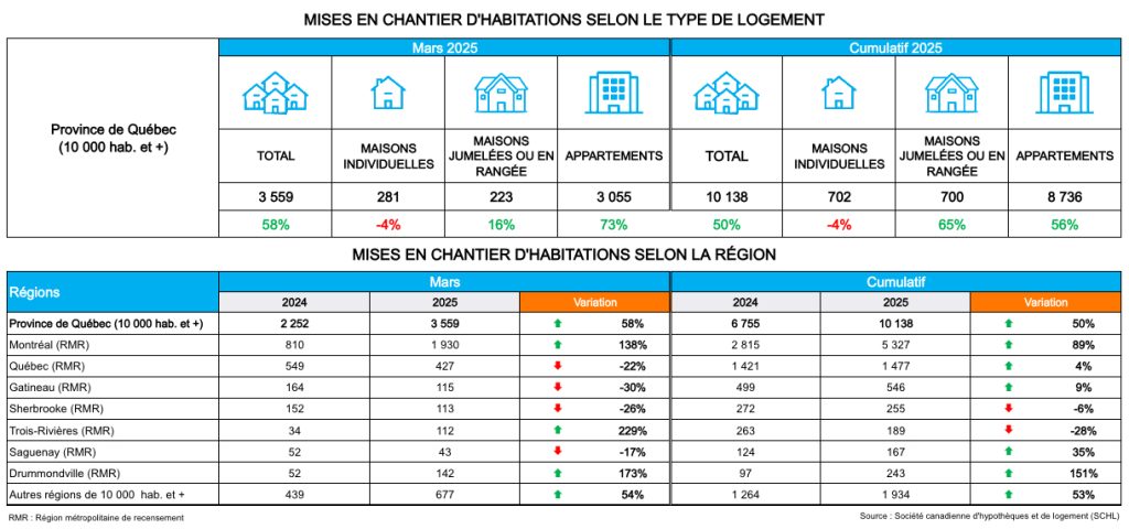 La Société canadienne d’hypothèques et de logement (SCHL) vient de publier les données sur les mises en chantier résidentielles pour le mois de mars 2025 dans les centres urbains de 10 000 résidents et plus. Au Québec, elle a recensé 3 559 habitations mises en chantier, soit une augmentation de 58 % comparativement à mars 2024.