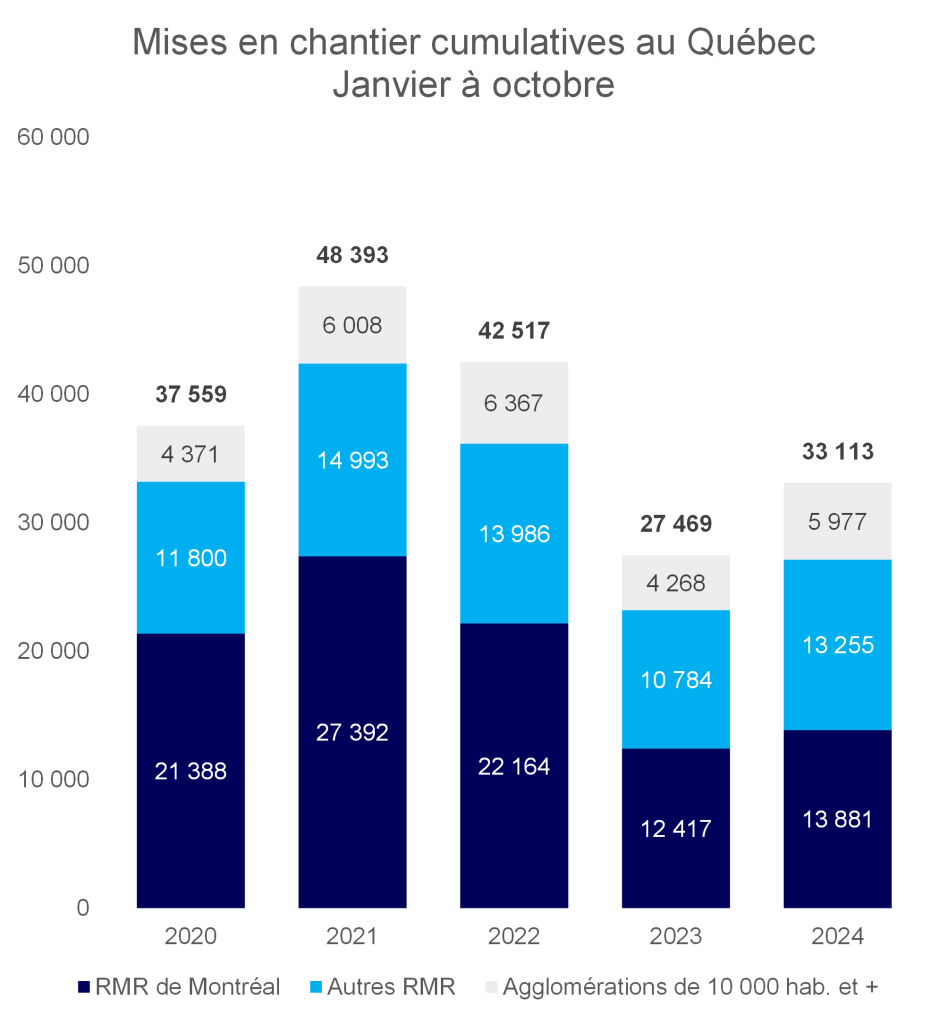 Après deux mois consécutifs de baisse, on renoue en octobre avec la hausse timide que l’on connaît depuis le début de 2024. L’essoufflement de la croissance des mises en chantier observée ces derniers mois semble confirmer les prévisions de l’APCHQ pour l’année 2024. Une hausse d’environ 15 % est attendue pour l’ensemble de l’année, mais est-ce suffisant considérant que l’année dernière représentait l’une des pires baisses des mises en chantier depuis 1955?