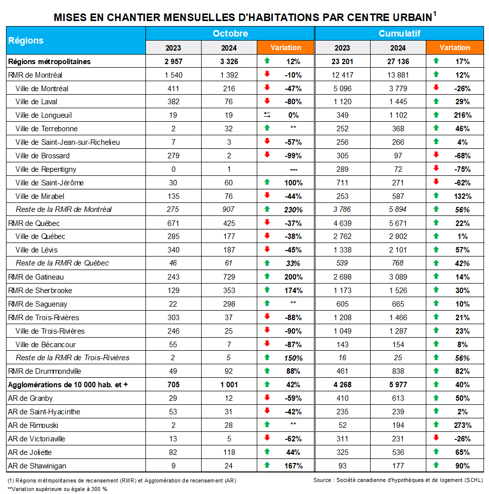 La Société canadienne d’hypothèques et de logement (SCHL) vient de publier les données sur les mises en chantier résidentielles pour le mois d’octobre 2024 dans les centres urbains de 10 000 habitants et plus. Au Québec, elle a recensé 4 327 habitations mises en chantier, soit une augmentation de 18 % comparativement à octobre 2023.