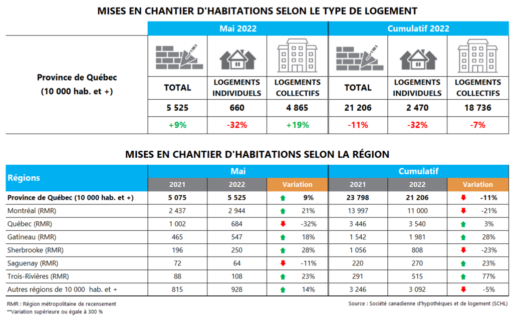 La Société canadienne d’hypothèques et de logement (SCHL) vient de publier les données sur les mises en chantier résidentielles pour le mois de mai 2022 dans les centres urbains de 10 000 habitants et plus. Au Québec, elle a recensé 5 525 habitations mises en chantier. Il s’agit d’une augmentation de 9 % comparativement à mai 2021, et d’une première hausse après cinq baisses mensuelles consécutives.