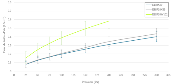 Figure 2 : Le taux de fuites d’air selon une aire unitaire permet de comparer l’étanchéité à l’air des assemblages testés. La mesure à 75 Pa est généralement la mesure de référence. On remarque que les assemblages E140X89 et E89F38X63 (assemblages possédant un isolant rigide à l’extérieur) possèdent tous les deux un taux de fuites d’air d’environ 0,17 L/sm2, alors que l’assemblage E89F38W102, composé d’une membrane Tyvek et d’un polyéthylène scellé comme pare-air, possède une valeur d’environ 0,33 L/sm2.