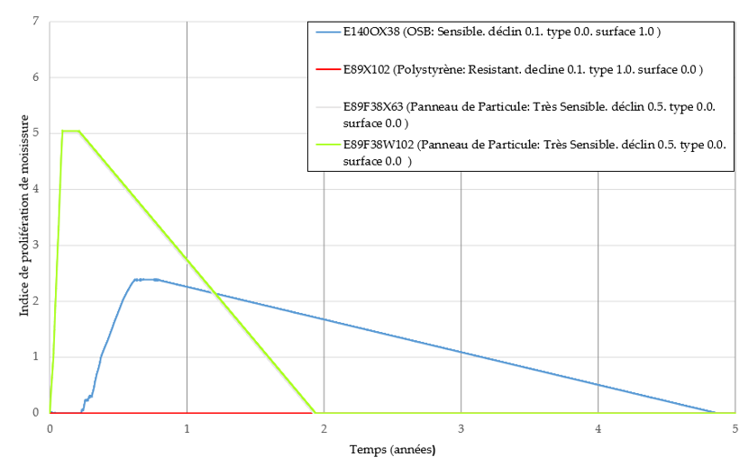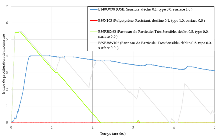 De façon générale, on remarque que les assemblages possédant un panneau de revêtement en fibre de bois atteignent un indice de prolifération plus élevé en début de vie alors que le matériau est très sensible à la prolifération de moisissures. Toutefois, étant donné la plus grande perméance de ces matériaux, le séchage de l’assemblage se fait à un taux plus rapide que l’assemblage E140X38 qui possède un panneau de revêtement OSB ayant une perméance plus basse. Quant à l’assemblage comportant simplement un panneau de polystyrène extrudé, la résistance plus élevée du matériau à la prolifération de moisissures et le maintien d’un profil de vapeur des deux côtés du matériau permettent de maintenir l’indice de prolifération à zéro. Les résultats de la simulation démontrent également que les assemblages à isolation par l’extérieur sont moins réactifs à la proportionnalité du taux d’infiltration alors que le taux de séchage de l’assemblage varie moins lorsque le taux d’infiltration augmente, comparativement à l’assemblage 140OX38.