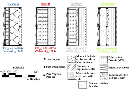Figure 1 : Assemblages testés en laboratoire ainsi que leurs valeurs de résistance thermique effective théorique selon un pourcentage d’aire de l’ossature de 23 % et un pourcentage d’aire de la cavité de 77 %, comme stipulé dans la section 9.36 du CNB 2015 pour des montants de bois à 406 mm c/c.