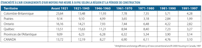 Une autre étude réalisée par le Conseil national de recherches Canada (CNRC) illustrait le changement avec un échantillonnage de 30 maisons construites en 1994 dans la région de Trois-Rivières, qui indiquait une moyenne de changement d’air à l’heure de 4,77.