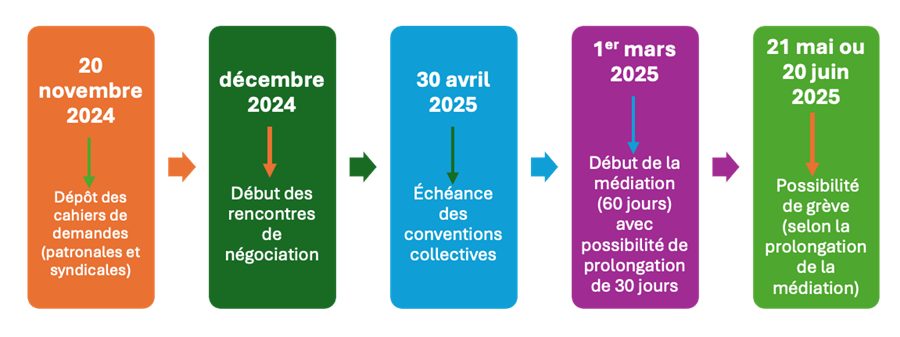 Pour qu’une grève puisse avoir lieu, la négociation collective doit d’abord passer par un processus de médiation obligatoire, lequel ne peut débuter avant le 1er mars 2025. Il revient au ministre du Travail de décider de la durée de cette médiation. D’une durée de 60 ou de 90 jours, toute médiation se terminera inévitablement le 21 mai ou le 20 juin 2025. Ce n’est qu’à compter de l’une de ces dates que des moyens de pression pourront être déclenchés. Rappelons que le médiateur, agissant comme tiers impartial, a justement pour fonction d’aider les parties à se rapprocher en vue de conclure un règlement équitable avant la mise en application d’une grève ou d’un lock-out.