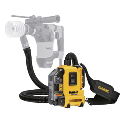 L’aspirateur modèle nºDWH161D1 de DeWalt se porte en bandoulière et est doté d’un boyau pouvant être branché sur tout type de capteur de poussière.