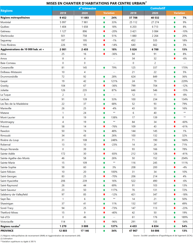 Le nombre de mises en chantier dans la province s’élève à 54 006 habitations, soit une croissance de 13 % par rapport à 2019. Ce nombre est composé d’un recensement de 47 232 nouvelles constructions dans les centres urbains de 10 000 habitants et plus (un sommet depuis au moins trente ans) et d’une estimation de 6 834 mises en chantier dans les zones rurales. Depuis 1990, seule l’année 2004 a été plus faste, grâce à un impressionnant total de 58 448 habitations entamées.