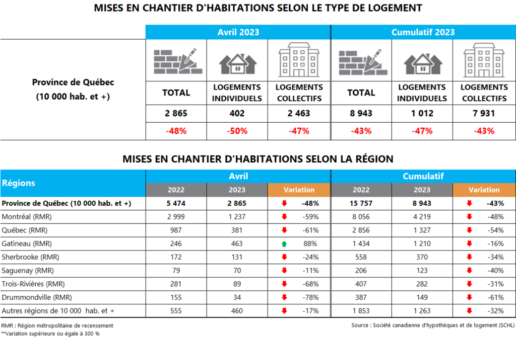 La Société canadienne d’hypothèques et de logement (SCHL) vient de publier les données sur les mises en chantier résidentielles pour le mois d’avril 2023 dans les centres urbains de 10 000 habitants et plus. Au Québec, elle a recensé 2 865 habitations mises en chantier, soit une diminution de 48 % comparativement à avril 2022. Il s’agit d’une huitième baisse mensuelle consécutive.