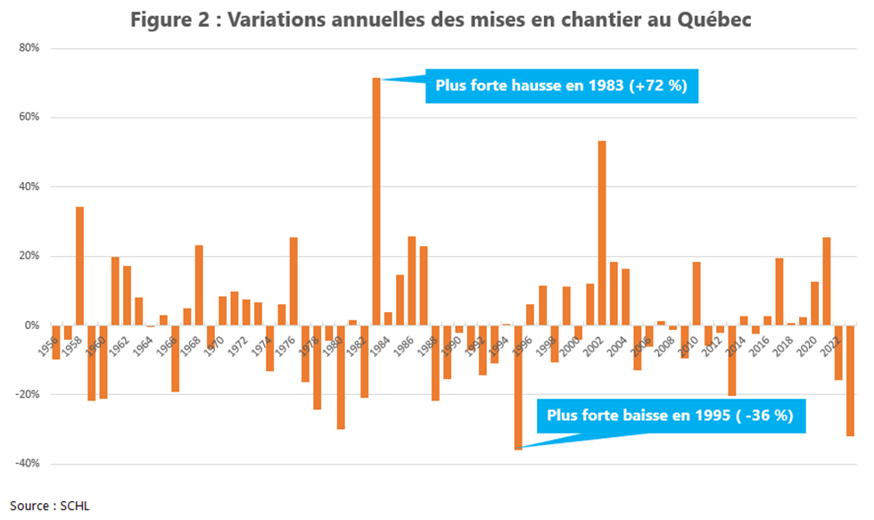 Au Québec, c’est 1995 qui remporte le titre peu enviable de pire année de l’histoire (voir Figure 1) et aussi celui de la chute la plus forte (-36 %) au cours d’une même année (voir Figure 2).