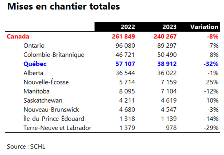 Finalement, on ne peut passer sous silence un autre constat peu reluisant concernant la construction résidentielle au Québec en 2023. Comme le montre le tableau ci-dessous, c’est dans la belle province que l’on a observé la chute (-32 %) des mises en chantier la plus marquée de tout le pays. Pendant ce temps, la construction résidentielle n’accusait que des baisses de 7 % en Ontario et de 1 % en Alberta, tandis qu’elle s’accélérait (+8 %) en Colombie-Britannique.
