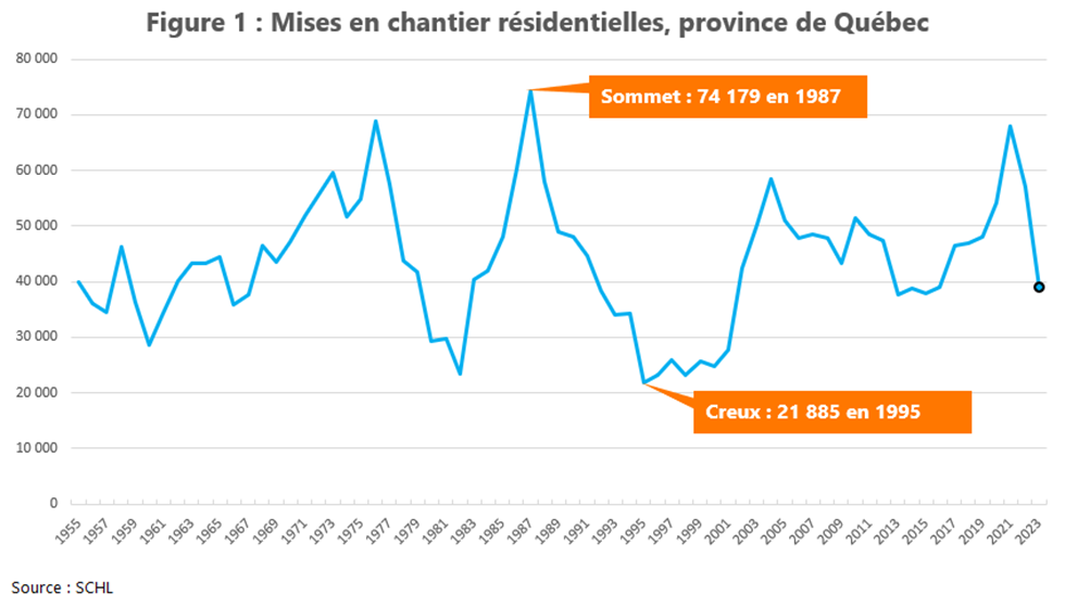 Les plus récentes données de la Société canadienne d’hypothèques et de logement (SCHL) sur les mises en chantier nous permettent de dresser le bilan de l’année 2023 de la construction résidentielle au Québec. Au total, 38 912 habitations ont levé de terre l’an dernier, soit une forte diminution de 32 % par rapport à 2022. Il s’agit de la deuxième baisse la plus prononcée à ce chapitre depuis que la SCHL comptabilise de telles données, c’est-à-dire 1955.