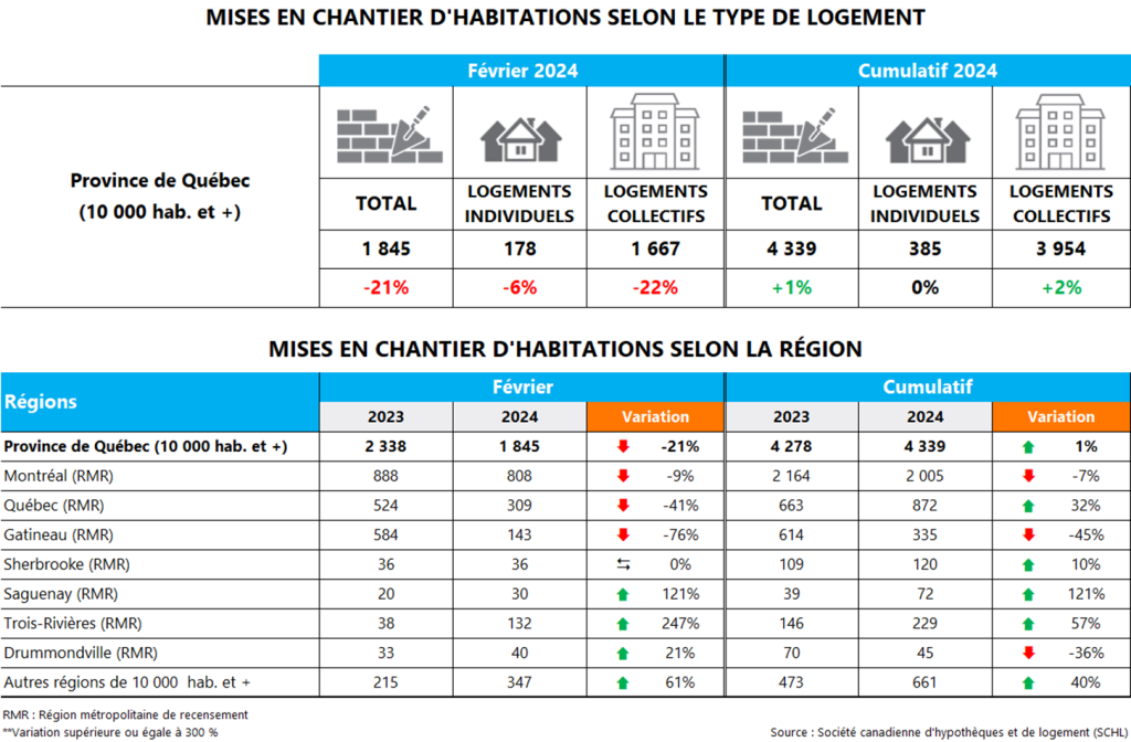 La Société canadienne d’hypothèques et de logement (SCHL) vient de publier les données sur les mises en chantier résidentielles pour le mois de février 2024 dans les centres urbains de 10 000 habitants et plus. Au Québec, elle a recensé 1 845 habitations mises en chantier, soit une diminution de 21 % comparativement à février 2023. Cette baisse survient après avoir enregistré des hausses de 36 % en décembre et de 29 % en janvier.
