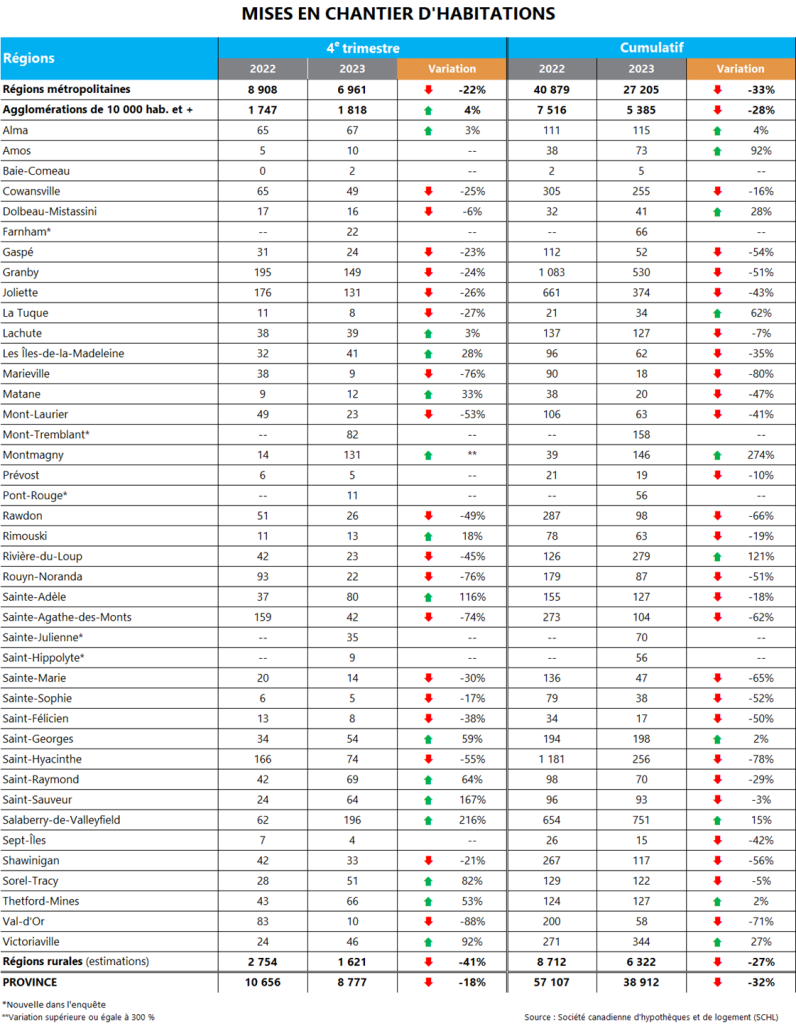 « Malgré ce très bon mois de décembre, l’année 2023 se termine par une baisse de 33 % des mises en chantier dans les centres urbains du Québec. Pour bien comprendre la mesure de ce résultat, il faut savoir qu’il s’agit d’une des plus fortes diminutions observées depuis que la SCHL compile les données, c’est-à-dire depuis 1955 », explique Paul Cardinal, directeur du Service économique de l’APCHQ.