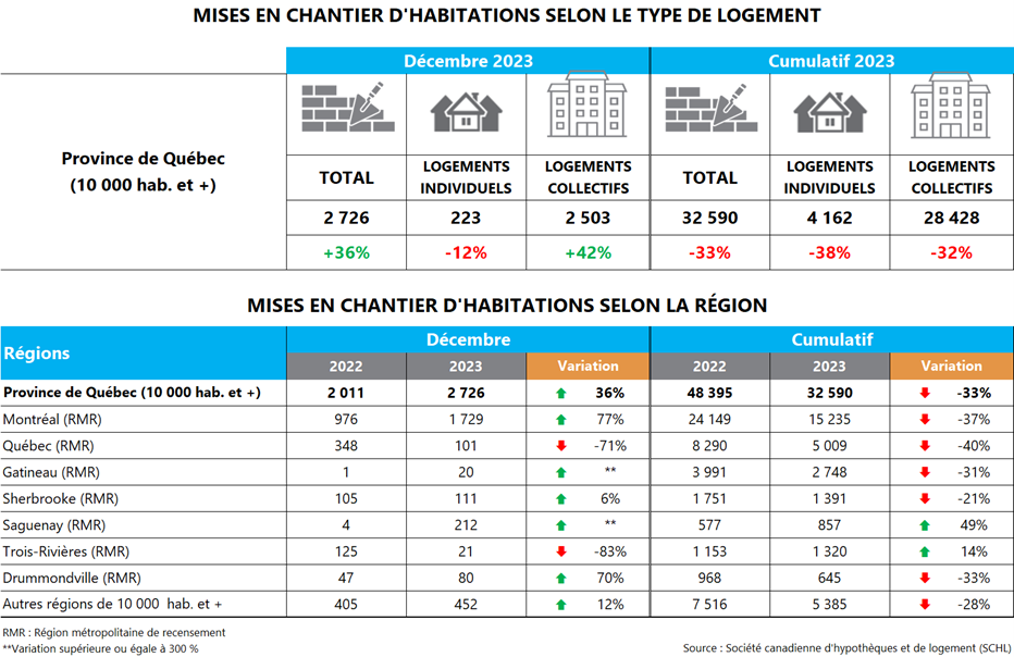 La Société canadienne d’hypothèques et de logement (SCHL) vient de publier les données sur les mises en chantier résidentielles pour le mois de décembre 2023 dans les centres urbains de 10 000 habitants et plus. Au Québec, elle a recensé 2 726 habitations mises en chantier, soit une augmentation de 36 % comparativement à décembre 2022. Il s’agit seulement de la deuxième hausse au cours des seize derniers mois.