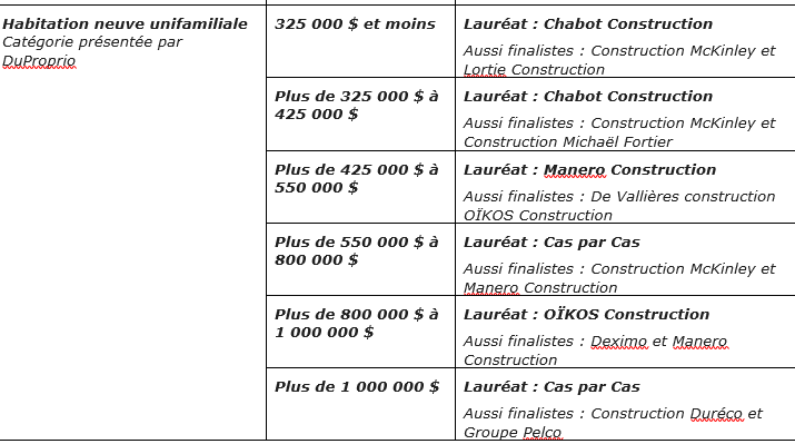 (prix excluant le terrain et les taxes, s’il y a lieu)