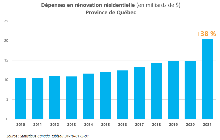 Néanmoins, il est clair que les ménages québécois ont davantage rénové. La pandémie a créé une conjonction exceptionnelle de facteurs favorables ayant stimulé la rénovation : le confinement et les généreux programmes de soutien gouvernementaux ont fait bondir le taux d’épargne, les taux hypothécaires sont descendus à un creux historique et les préférences des consommateurs ont changé. Bon nombre de propriétaires ont alors choisi de rediriger une partie des sommes qu’ils auraient autrement dépensées en sorties et en loisirs vers l’entretien, la réparation ou l’amélioration de leur demeure. Pour plusieurs, celle-ci, en plus d’être leur espace de vie, est devenue l’endroit où ils travaillent et se divertissent. Être bien chez soi prend alors tout son sens.