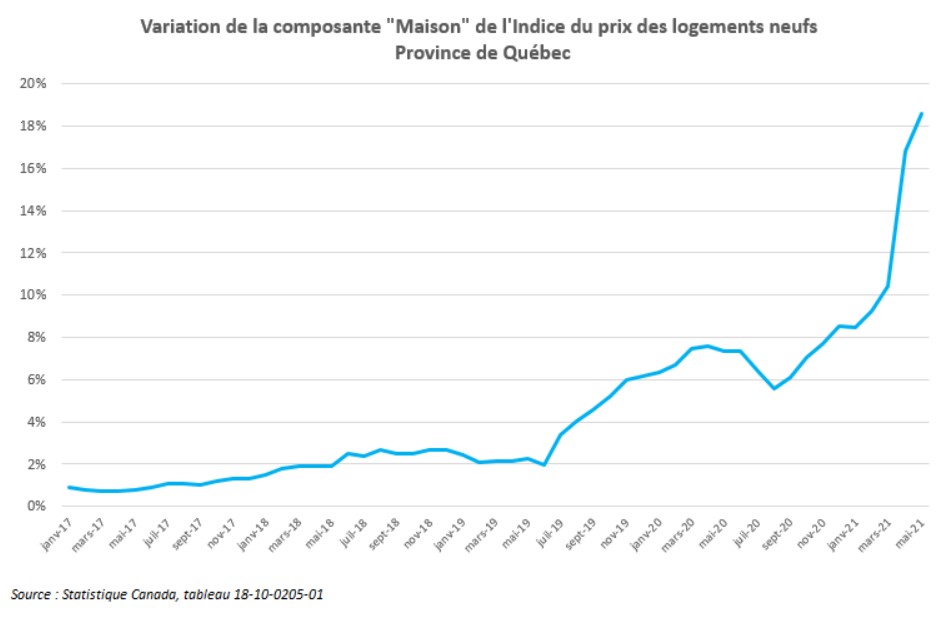 De mai 2020 à mai 2021, l’indice globale a crû de 16,6 %, du jamais vu depuis que cet indice permet de calculer les variations du prix de vente des maisons résidentielles neuves[2], soit depuis 1987.