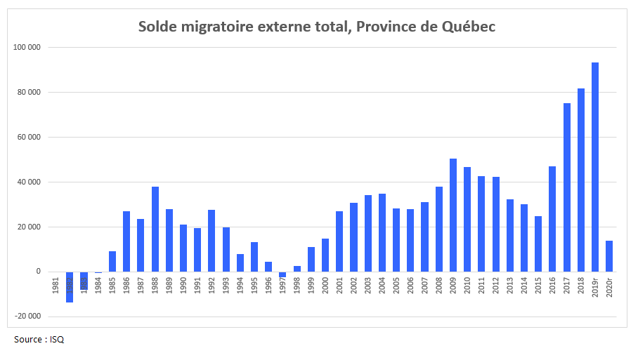 Avant la pandémie de COVID-19, la migration au Québec exultait. Ayant battu de nouveaux records pendant trois années consécutives, le solde migratoire externe net[1] a culminé en 2019. Nous avions alors accueilli 93 474 personnes, un sommet absolu depuis que les données sont disponibles (1962). Toutefois, en raison des mesures sanitaires et des restrictions de déplacement aux frontières liées à la pandémie, notre solde migratoire externe a fondu à un maigre 14 037 personnes en 2020, le plus faible résultat en deux décennies.