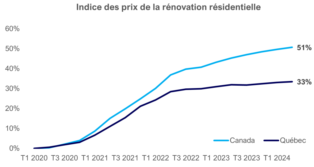 En outre, les coûts de construction de bâtiments résidentiels, on observe au Québec une stabilisation des coûts de rénovation résidentielle depuis 2022. On note une augmentation d’environ 1 % au deuxième trimestre de 2024 comparativement à la même période l’année précédente. De plus, lorsque l’on se compare à la moyenne canadienne, on note que les coûts de rénovation ont moins augmenté au Québec depuis le début de la pandémie.
