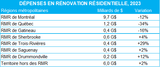 Cette diminution est principalement attribuable aux trois plus grandes régions métropolitaines : Montréal, Québec et Gatineau. En revanche, dans le reste de la province, les dépenses en rénovation ont connu une hausse notable. La région de Trois-Rivières s’illustre particulièrement avec une croissance de 29 % des investissements, malgré des taux d’intérêt élevés.