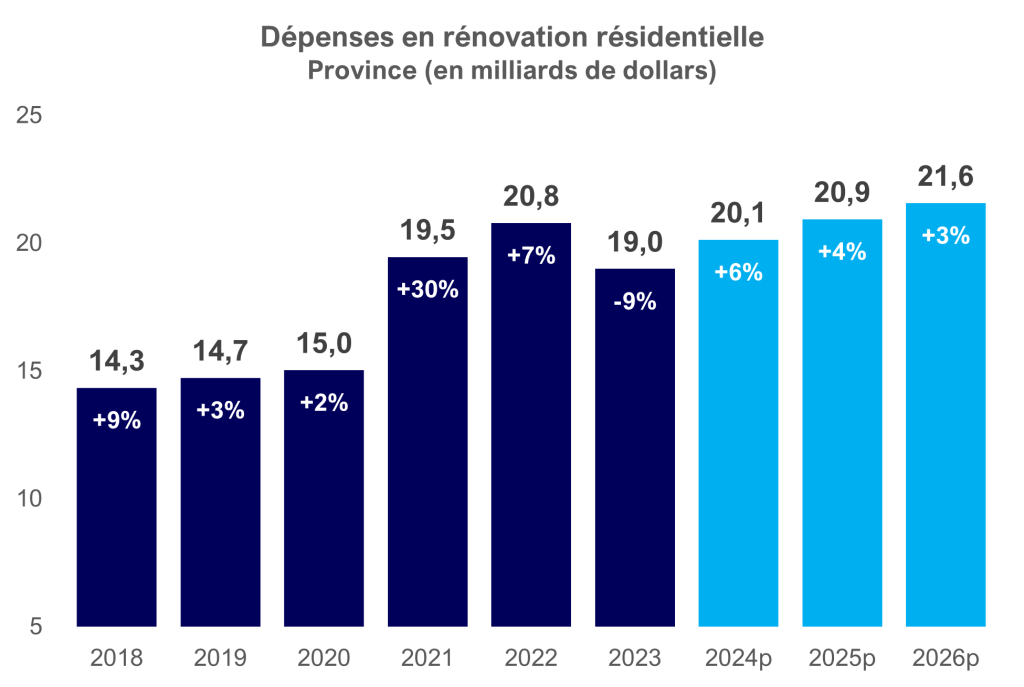 La reprise des dépenses en rénovation devrait se poursuivre en 2025 et 2026, stimulées par les baisses de taux d’intérêt, la stabilisation des coûts de rénovation et certains programmes gouvernementaux d’aide à la rénovation4. L’incertitude économique entourant l’élection de Donald Trump risque toutefois de repousser l’échéancier de certains projets de rénovation, notamment dans les régions économiques dépendant grandement du commerce international avec les États-Unis. Ainsi, nous anticipons un retour progressif à la tendance observée entre 2010 et 2019, avec une croissance des dépenses de 4 % en 2025 (20,9 milliards de dollars) et de 3 % en 2026 (21,6 milliards de dollars).