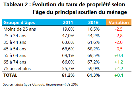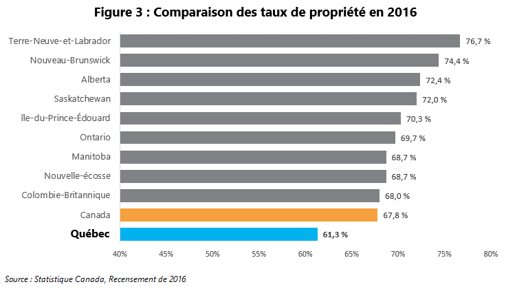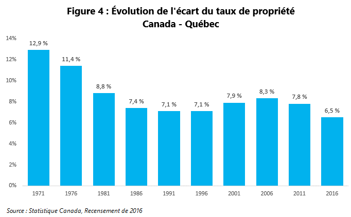 Malheureusement, le récent rétrécissement de l’écart entre les deux derniers recensements n’est pas attribuable à la mince progression de 0,1 % du Québec, mais plutôt à un recul de la moyenne canadienne du taux de propriété.