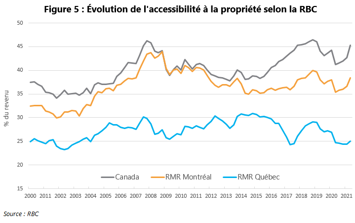 La RBC (3) faisait récemment état que l’accessibilité à la propriété au Canada venait d’enregistrer sa détérioration la plus importante en plus de 30 ans. La banque publie une mesure de l’accessibilité qui correspond, pour un marché donné, à la part du revenu d’un ménage avant impôt nécessaire pour couvrir les versements hypothécaires en capital et en intérêts, l’impôt foncier et le coût des services publics en fonction du prix courant médian d’une habitation (4). Les résultats du 2e trimestre de 2021 ne sont guère réjouissants pour plusieurs régions. La frénésie immobilière du printemps a fait augmenter la mesure de RBC jusqu’à 45,3 % (5) pour l’ensemble du Canada, toutes catégories de propriété confondues, annulant tous les gains enregistrés durant la pandémie au chapitre de l’accessibilité à la propriété (6) (voir Figure 5).