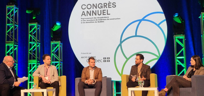 Félix Cadotte, conseiller en développement durable à l’APCHQ, a participé au panel de discussion intitulé « Comment la collaboration entre les acteurs de la chaîne de valeur peut-elle améliorer la circularité? » Il a partagé les initiatives de nos membres qui privilégient la déconstruction plutôt que la démolition, favorisant une meilleure circularité dans notre industrie, ainsi que des nouvelles du projet pilote de tri en chantier mis sur pied par l’APCHQ.