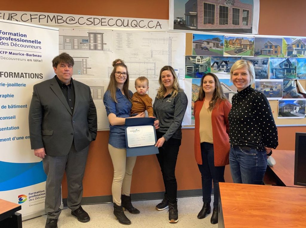 Ayant débuté sa formation à distance lorsque son bébé avait seulement 1 mois, c’est en compagnie de son petit garçon de 14 mois que Jessie Poirier a choisi de recevoir sa bourse, puisque cela représente bien son parcours académique empreint de persévérance et de conciliation travail-famille. De gauche à droite : Benoît Thibault, directeur du CFP Maurice-Barbeau, Jessie Poirier, récipiendaire de la bourse, Gabrielle Maheux, conseillère sénior relations du travail de l’APCHQ, Laurence Morand-Béland, coordonnatrice communication et web à l’APCHQ – région de Québec et Julie Blanchet, coordonnatrice des partenariats à l’APCHQ – région de Québec.