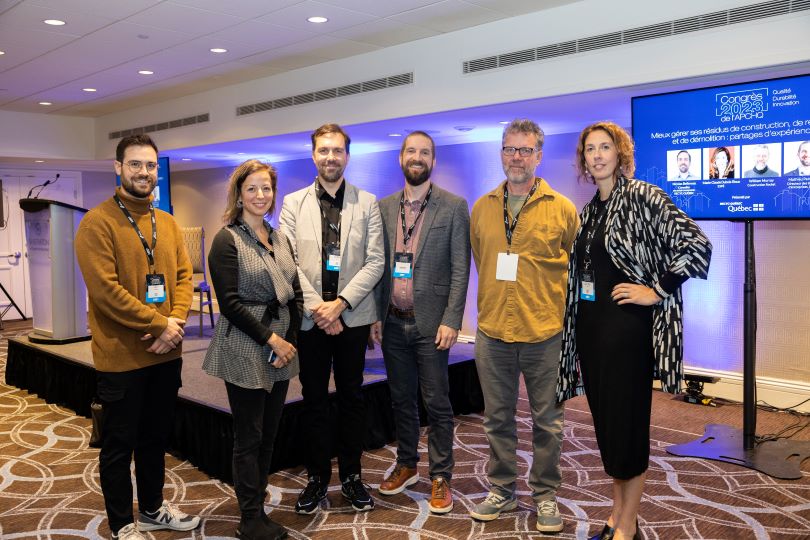 De gauche à droite sur la photo : Félix Cadotte et Karine Casault de l’APCHQ, Nicolas Bellerose de RECYC-QUÉBEC, Mathieu Painchaud de Stratzer, William Murray de Construction Rocket et Marie-Claude Dubois-Rioux de ESPÉ Montréal.