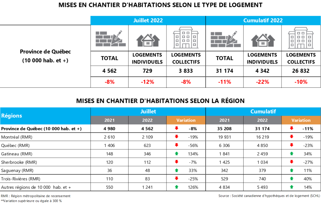 La Société canadienne d’hypothèques et de logement (SCHL) vient de publier les données sur les mises en chantier résidentielles pour le mois de juillet 2022 dans les centres urbains de 10 000 habitants et plus. Au Québec, elle a recensé 4 562 habitations mises en chantier. Il s’agit d’une diminution de 8 % comparativement à juillet 2021.