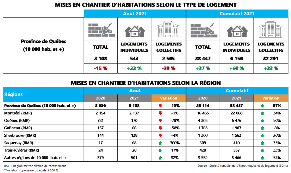 La Société canadienne d’hypothèques et de logement (SCHL) vient de publier les données sur les mises en chantier résidentielles pour le mois d’août 2021 dans les centres urbains de 10 000 habitants et plus. Au Québec, elle a recensé 3 108 habitations mises en chantier. Il s’agit d’une diminution de 15 % comparativement à août 2020, et d’un premier recul en trois mois.