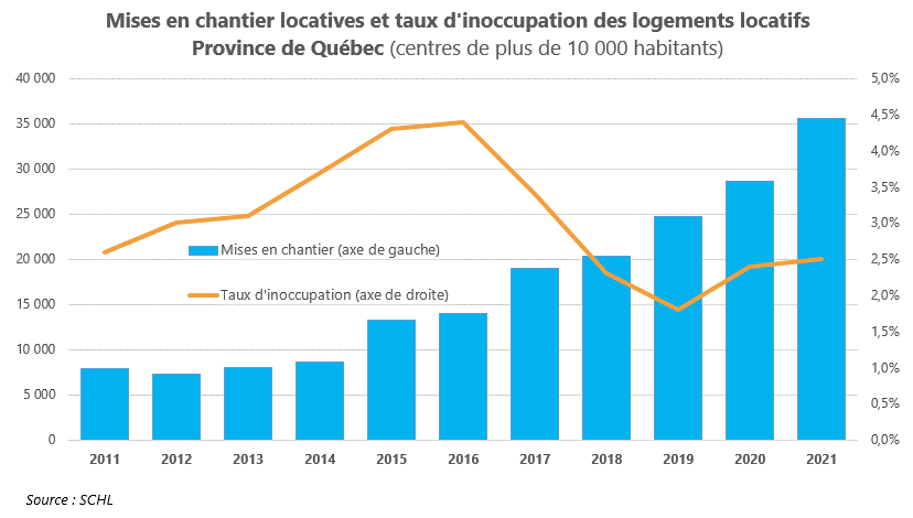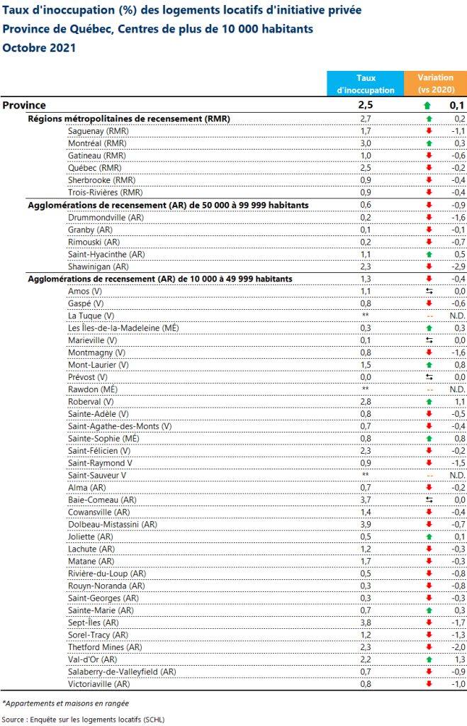 La Société canadienne d’hypothèques et de logement (SCHL) vient de publier les résultats de sa dernière enquête, réalisée l’automne dernier, portant sur les logements locatifs dans les centres urbains du Québec. Pour l’ensemble de la province, le taux d’inoccupation des logements locatifs d’initiative privée a à peine bougé, passant de 2,4 % en 2020 à 2,5 % en 2021.