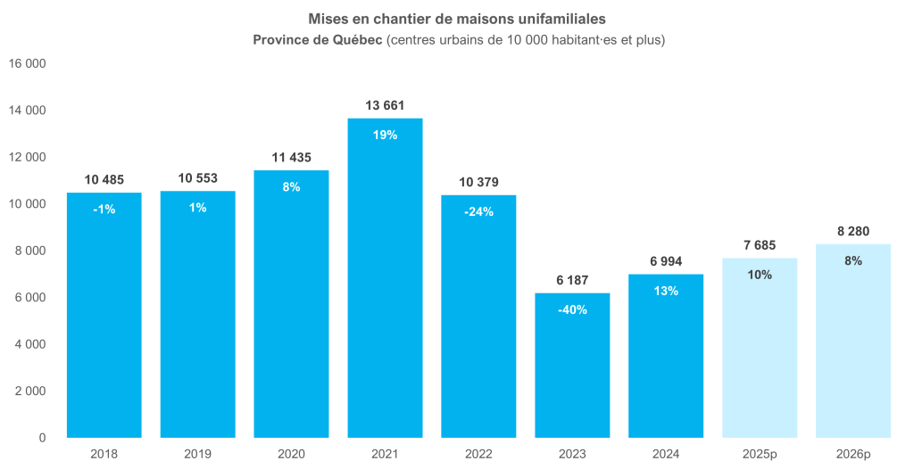 Malgré la légère recrudescence prévue au cours des deux prochaines années, le nombre de mises en chantier de maisons unifamiliales demeurera très faible d’un point de vue historique. Nous anticipons environ 7 700 nouvelles maisons en 2025 et près de 8 300 en 2026.