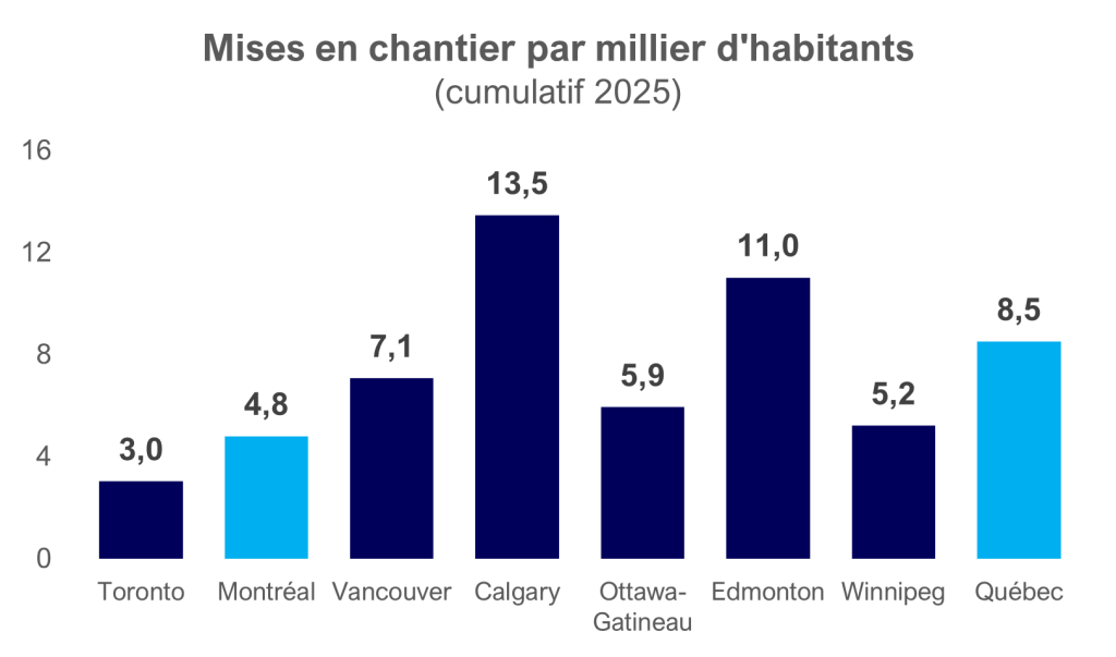 En effet, la région de Calgary a mis en chantier 13,5 logements par millier d’habitants depuis le début de l’année alors qu’on en compte seulement 3 pour Toronto. En comparaison, Montréal et Québec ont mis en chantier 4,8 et 8,5 logements par millier d’habitants, respectivement.