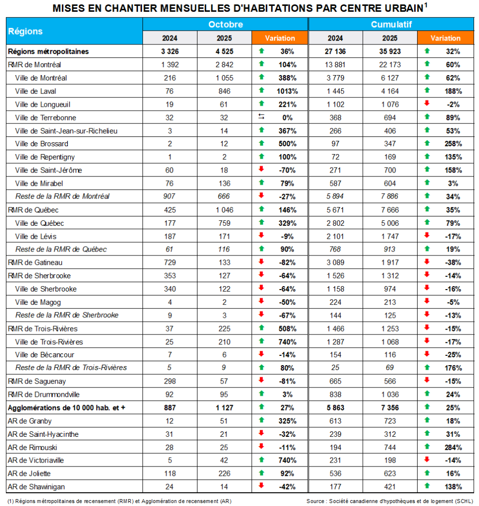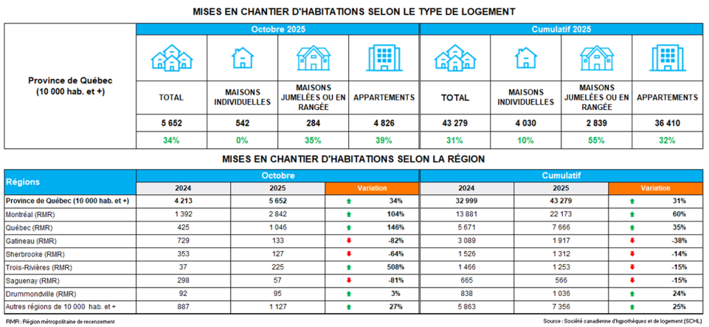 La Société canadienne d’hypothèques et de logement (SCHL) vient de publier les données sur les mises en chantier résidentielles pour le mois d’octobre 2025 dans les centres urbains de 10 000 résidents et plus. Au Québec, elle a recensé 5 652 habitations mises en chantier, soit une augmentation de 34 % comparativement à octobre 2024.