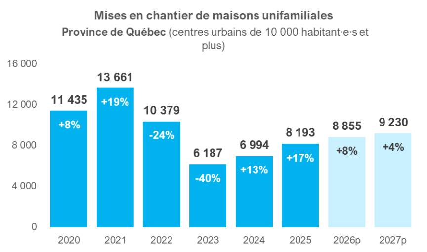 L’allègement de la TPS pour les premier·ère·s acheteur·euse·s devrait soutenir les mises en chantier au cours des prochaines années. Toutefois, il ne faut pas s’attendre à un retour aux moyennes historiques. L’APCHQ anticipe la construction de 8 855 nouvelles maisons en 2026 et de 9 230 en 2027.