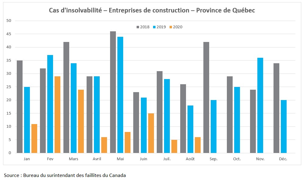 Le confinement du printemps, qui a entraîné la fermeture complète des chantiers de construction entre le 24 mars et le 19 avril, puis une fermeture partielle jusqu’au 11 mai, ne semble donc pas avoir laissé autant de séquelles que ce que l’on aurait pu croire. Force est de constater que les mesures gouvernementales de soutien aux entreprises[1] telles que la subvention salariale d’urgence, le compte d’urgence aux entreprises et l’aide d’urgence aux petites entreprises ont contribué à limiter le nombre d’entreprises en difficulté. Il faut dire par ailleurs que la reprise dans la construction et la rénovation a été très robuste depuis la fin du confinement.