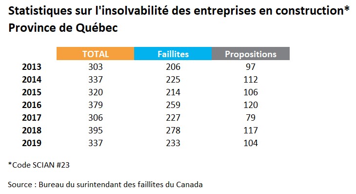 Depuis 2013, le Bureau du surintendant des faillites du Canada enregistre entre 300 et 400 cas d’insolvabilité (faillites et propositions) d’entreprises (voir tableau) dans l’ensemble du secteur de la construction (construction résidentielle et non résidentielle, travaux de génie, entrepreneurs spécialisés) au Québec.