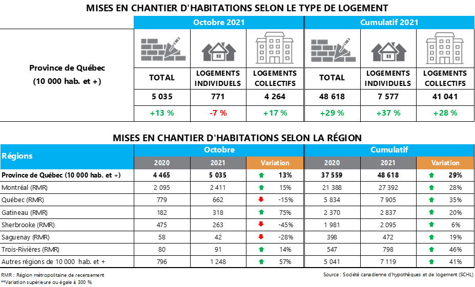 La Société canadienne d’hypothèques et de logement (SCHL) vient de publier les données sur les mises en chantier résidentielles pour le mois d’octobre 2021 dans les centres urbains de 10 000 habitants et plus. Au Québec, elle a recensé 5 035 habitations mises en chantier. Il s’agit d’une augmentation de 13 % comparativement à octobre 2020, et d’une huitième hausse mensuelle en dix mois depuis le début de 2021.