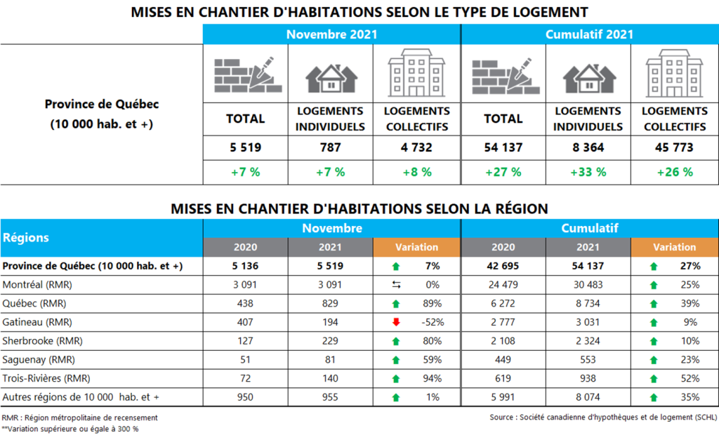 La Société canadienne d’hypothèques et de logement (SCHL) vient de publier les données sur les mises en chantier résidentielles pour le mois de novembre 2021 dans les centres urbains de 10 000 habitants et plus. Au Québec, elle a recensé 5 519 habitations mises en chantier. Il s’agit d’une augmentation de 7 % comparativement à novembre 2020, et d’une neuvième hausse mensuelle en onze mois depuis le début de 2021.