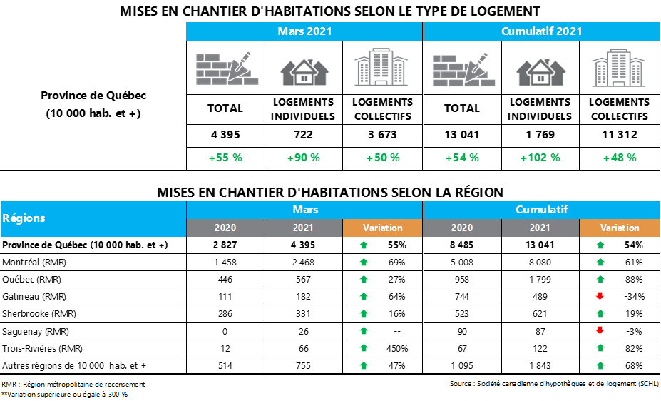 En mars, la construction de maisons individuelles a bondi de 90 %, grâce à 722 nouvelles fondations coulées. La construction de logements collectifs (appartements, maisons jumelées et maisons en rangée) a quant à elle crû de 50 %, avec 3 673 mises en chantier. Ainsi, les logements collectifs occupent toujours la part du lion, soit 84 % des nouvelles unités.