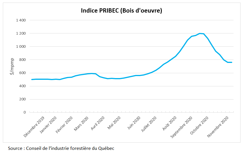 Selon l’indice PRIBEC, produit par le Conseil de l’industrie forestière du Québec, le prix du bois d’œuvre résineux a doublé entre le début du confinement à la mi-mars et la mi-septembre. À son sommet, l’indice a atteint 1 200 $/mpmp* la semaine du 18 septembre. La diminution prolongée de la production dans les scieries canadiennes en raison de la pandémie est certes en bonne partie responsable de la situation. En ce qui a trait à la demande pour le bois de construction, elle a dépassé toutes les attentes depuis le début de la crise sanitaire. Les chantiers sont demeurés ouverts aux États-Unis et la construction de maisons neuves a surpris par sa vigueur. Au même moment, des deux côtés de la frontière, les consommateurs en confinement ont redirigé une partie de leur budget loisirs en rénovations, faisant exploser les activités de rénovation.