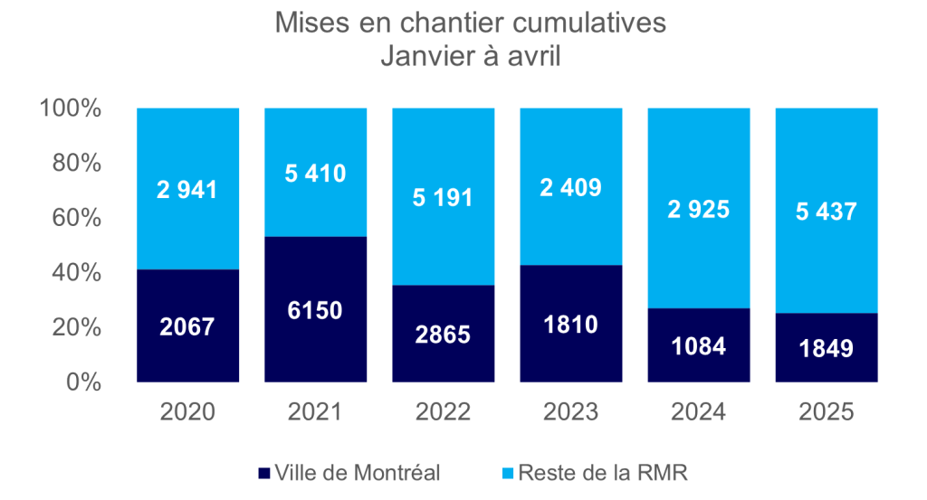 Les mises en chantier à Montréal ont plus que doublé en avril par rapport à la même période l’année précédente. Au total, la construction de 417 unités locatives et d’une maison a débuté en avril, soit une hausse de 136 %. Toutefois, Montréal représente une part décroissante de la construction résidentielle de la région métropolitaine. Durant les quatre premiers mois de l’année, seulement le quart des mises en chantier de la région étaient à Montréal.