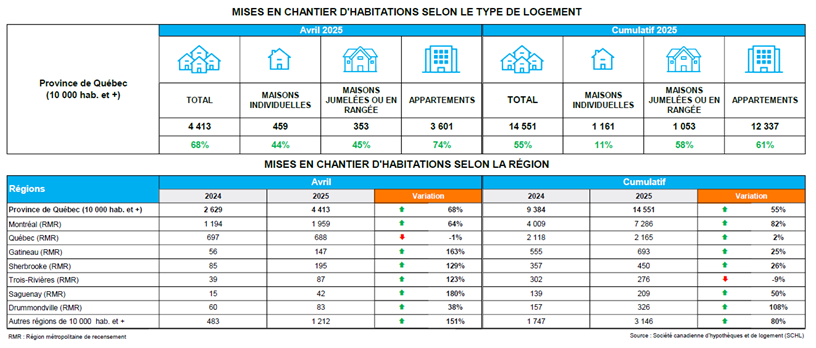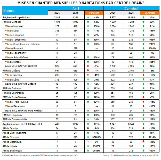 Plusieurs régions métropolitaines du Québec ont vu leur nombre de mises en chantier plus que doubler en avril 2025, dont Saguenay (+180 %), Gatineau (+163 %), Sherbrooke (+129 %) et Trois-Rivières (+123 %). La région métropolitaine de Québec est la seule à avoir connu une baisse des mises en chantier en avril 2025, et ce, de seulement 1 %. Malgré la hausse des maisons mises en chantier le mois dernier, les appartements locatifs représentent plus de 80 % des nouvelles habitations au Québec.