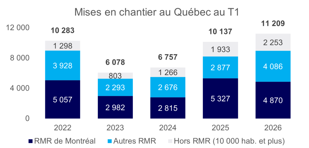 Cette accélération des mises en chantier en mars permet de conclure le 1er trimestre avec une hausse de 12 % des mises en chantier par rapport à la même période en 2025. La baisse observée en janvier a pesé lourdement sur la performance du marché en début d’année. Encore une fois, c’est le marché locatif qui vole la vedette : près de 85 % des mises en chantier au cours des trois premiers mois de 2026 sont des unités locatives. Ce segment du marché a connu une hausse de 16 % par rapport à la même période l’année dernière. Sur le plan géographique, seules deux régions métropolitaines ont connu une diminution au 1er trimestre, soit Montréal (-9 %) et Drummondville (-7 %). Dans les deux cas, le nombre de mises en chantier est supérieur à la moyenne historique.