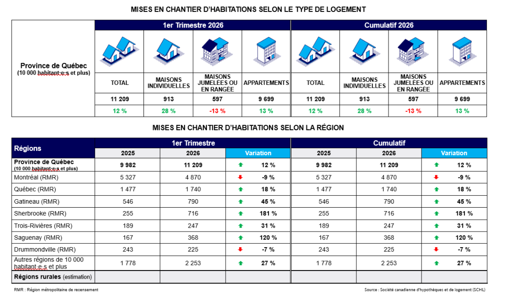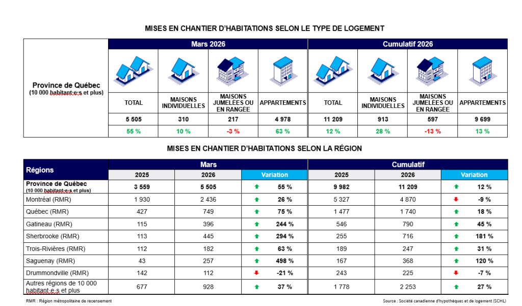 La Société canadienne d’hypothèques et de logement (SCHL) vient de publier les données sur les mises en chantier résidentielles pour le mois de mars 2026 dans les centres urbains de 10 000 habitants et plus. Au Québec, elle a recensé 5 505 habitations mises en chantier, soit une augmentation de 55 % comparativement à mars 2025.
