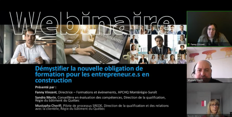 Afin de répondre à toutes ces questions et à plusieurs autres, Fanny Vincent de l’Association des professionnels de la construction et de l’habitation du Québec (APCHQ) – région Montérégie-Suroît ainsi que Sandra Morin et Mustapha Cherifi de la RBQ ont présenté un webinaire intitulé Démystifier la nouvelle obligation de formation pour les entrepreneur.e.s en construction.