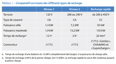 Mentionnons que les bornes de recharge les plus rapides sont celles pouvant acheminer le plus de puissance. Comme vous pourrez le constater dans le tableau comparatif des types de recharge, le temps de l’opération varie entre 20 minutes et 12 heures, selon la performance du système utilise.